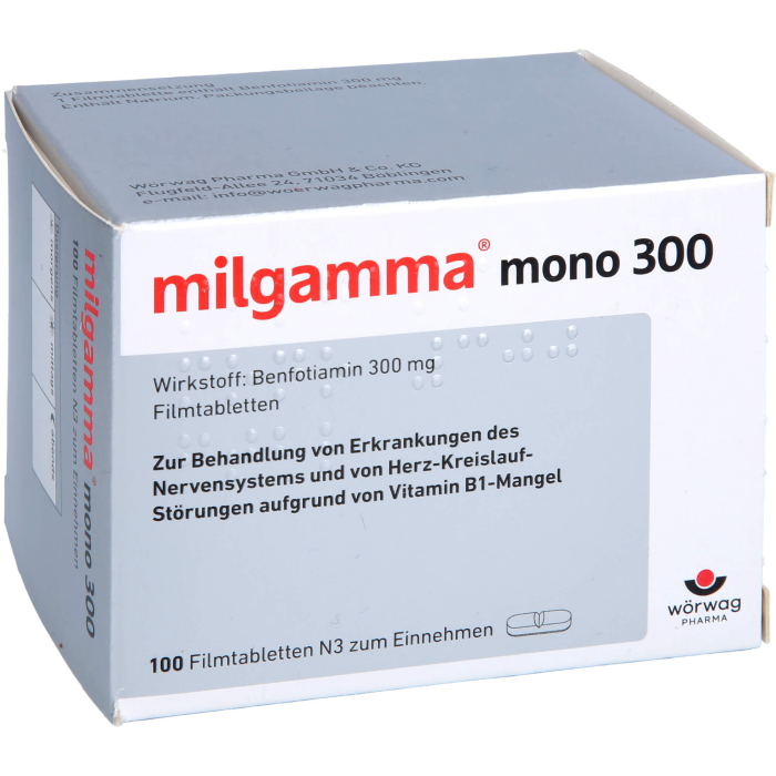 Das Arzneimittel ist ein Vitaminpräparat.AnwendungsgebietGesicherte Anwendungsgebiete für die Monopräparate sind ausschließlich Therapie oder Prophylaxe von klinischen Vitamin-B1-Mangelzuständen, sofern diese nicht ernährungsmäßig behoben werden können.Der klinisch gesicherte Vitamin-B1-Mangel kann auftreten bei:Mangel- und Fehlernährung (z.B. Beriberi), parenteraler Ernährung über lange Zeit, Null Diät, Hämodialyse, Malabsorption, chronischem Alkoholismus (alkoholtoxische Kardiomyopathie, Wernicke-Enzephalopathie, Korsakow-Syndrom), gesteigertem Bedarf (z.B. Schwangerschaft und Laktation), Diabetes mellitus.Behandlung von Neuropathien und kardiovaskulären Störungen, die durch Vitamin-B1-Mangel hervorgerufen werden.